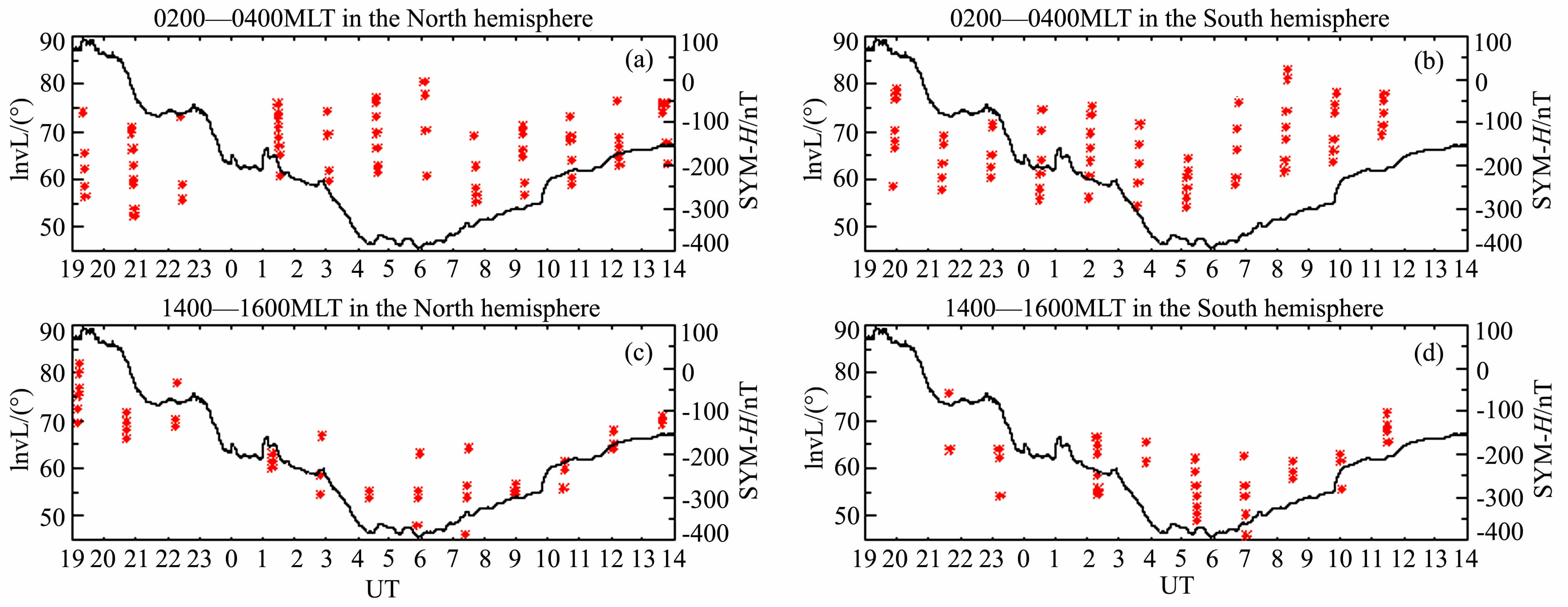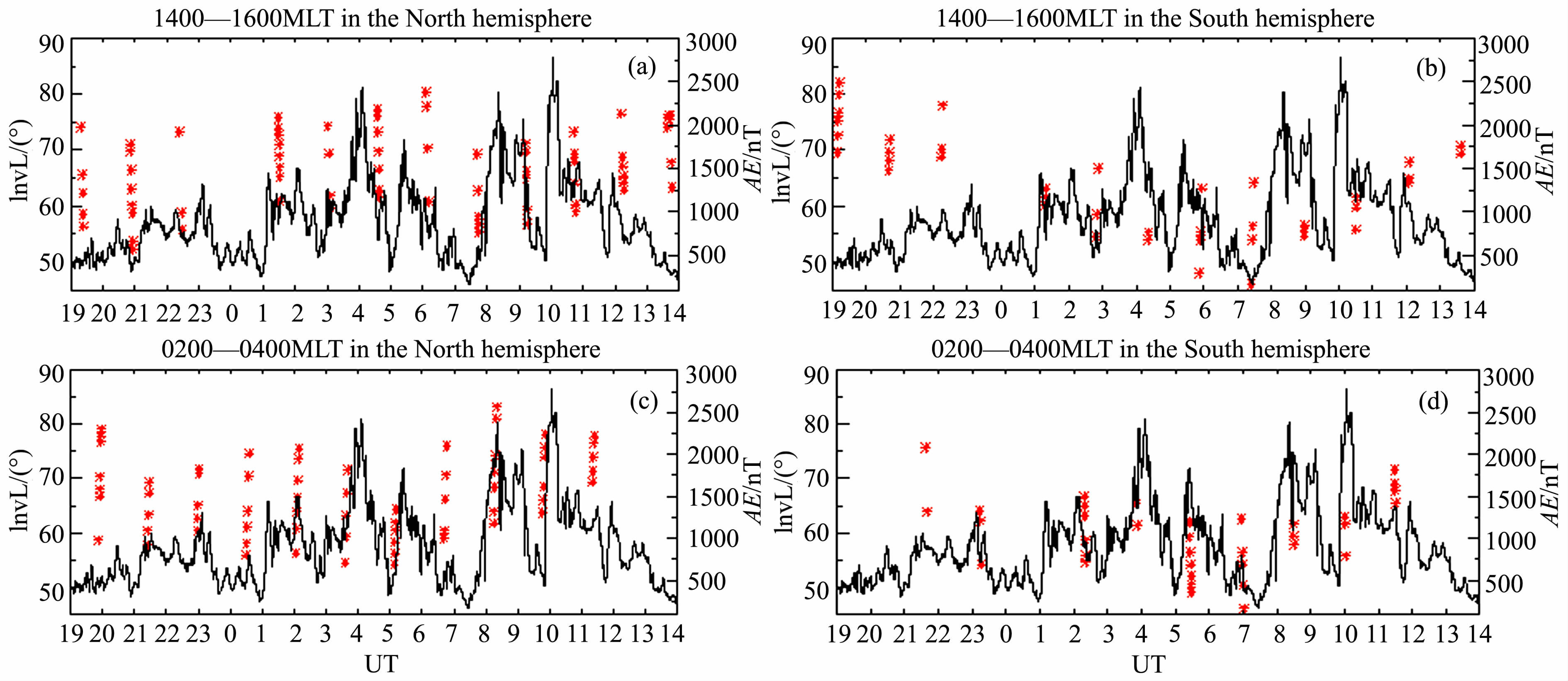 图 7给出了此次磁暴事件期间大尺度场向电流片纬度位置的UT分布及其与AE指数的对比,图中每个红色星号同样代表一个电流片,左侧y轴表示该电流片对应的不变纬度位置;黑色曲线代表AE指数,右侧y轴对应其大小.可以看出,在早上扇区,南北半球的电流片分布和AE指数的变化有很好的对应,电流片的纬度分布与AE指数的起伏变化基本一致,再次说明早上扇区对应着亚暴电流楔的出现位置,这里的电流片分布特征更多地受到亚暴活动的控制.