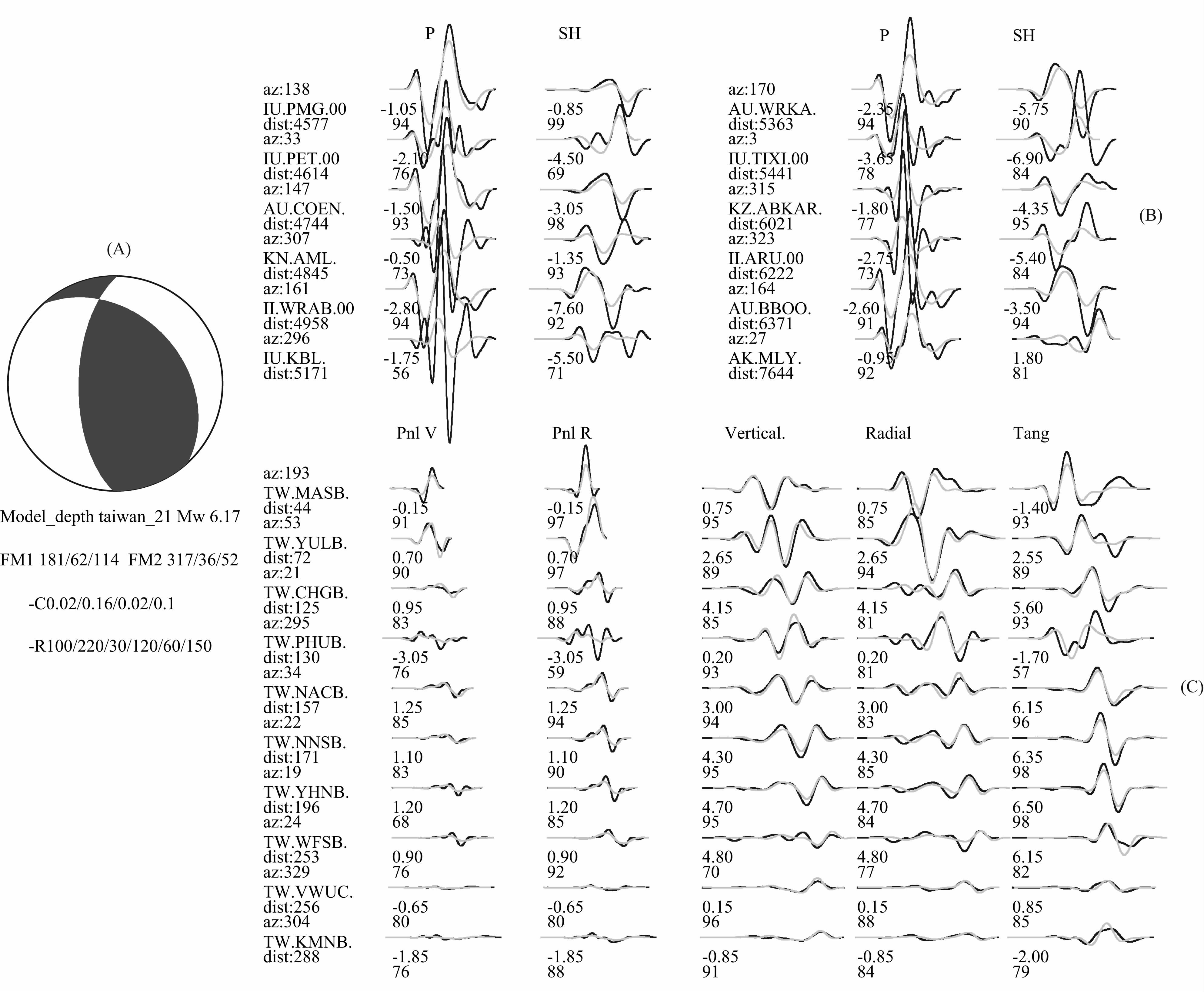 图 2 高雄地震CAP联合反演结果(A)以及实际波形(B)与合成波形之对比(C) 近台Pnl波与远台P波采用0.02 Hz至0.16 Hz带通滤波,而近台面波与远台SH波滤波范围则为0.02至0.1Hz.粗灰线代表合成地震图,细黑波形代表观测波形.波形下的两列数字分别代表获得理论和观测波形间最大相关系数所需要的时移(上)以及最大相关系数百分比(下),平移时间为正代表合成图的到时早于实际数据,台站名下方数字分别表示震中距和方位角. Fig. 2 CAPjoint modeling for Kaohsiung Earthquake Local Pnl and teleseismic P waveforms are filtered between 0.02〜0.16 Hz,while local surface waves and teleseismic SH waveforms are filtered between 0.02 to 0.1 Hz,with black thin lines as data and gray thick lines as synthetic.Numbers under the seismograms are time shifts (upper) and cross-correlation coefficient in percent (lower).Positive time shifts indicate that synthetic waveforms have been delayed. |
