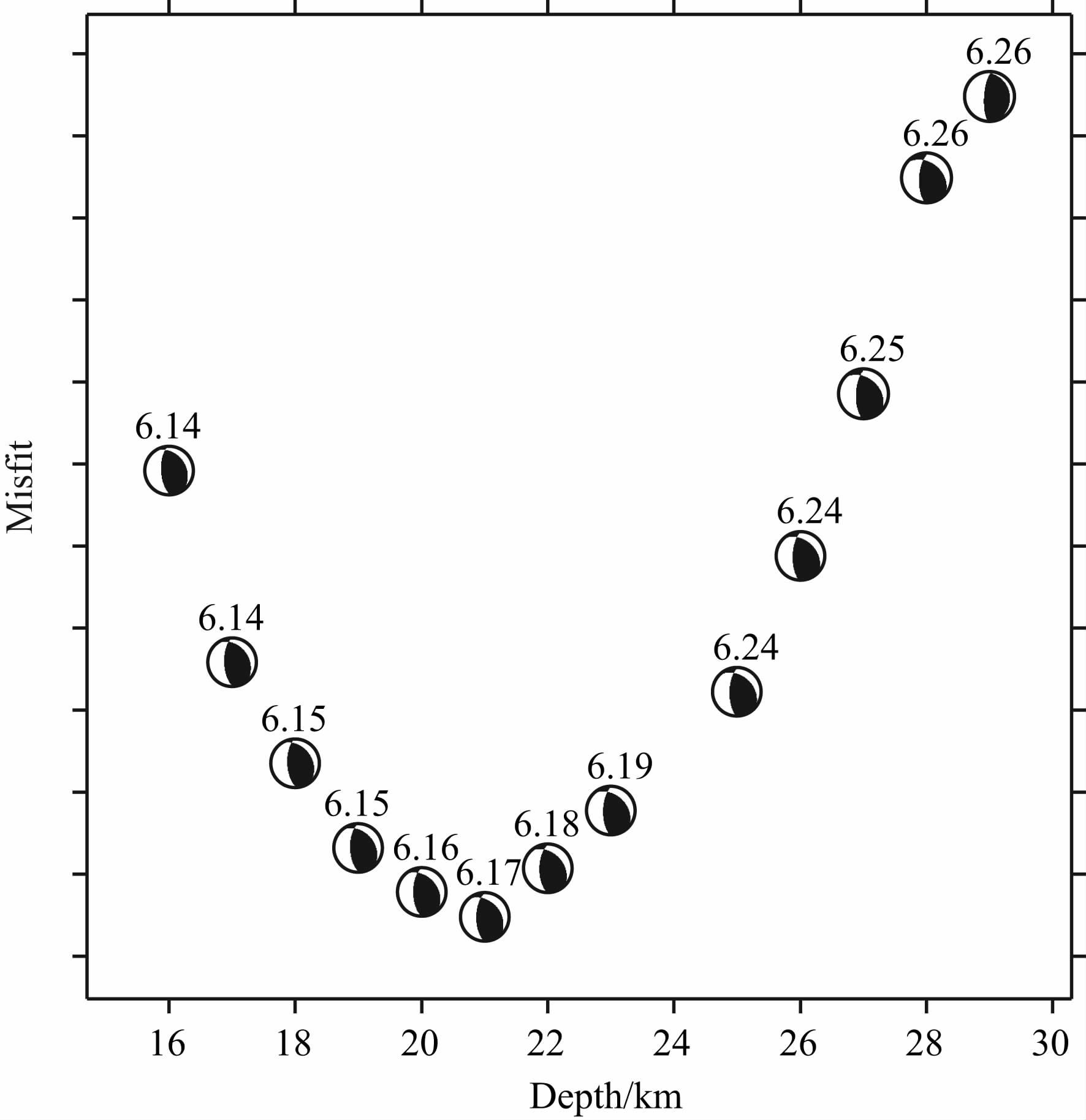 图 3 反演误差随深度变化图 震源球上的数字为反演所得的矩震级. Fig. 3 Inversion misfit versus focal depth Number above the beach ball is corresponding Mw |