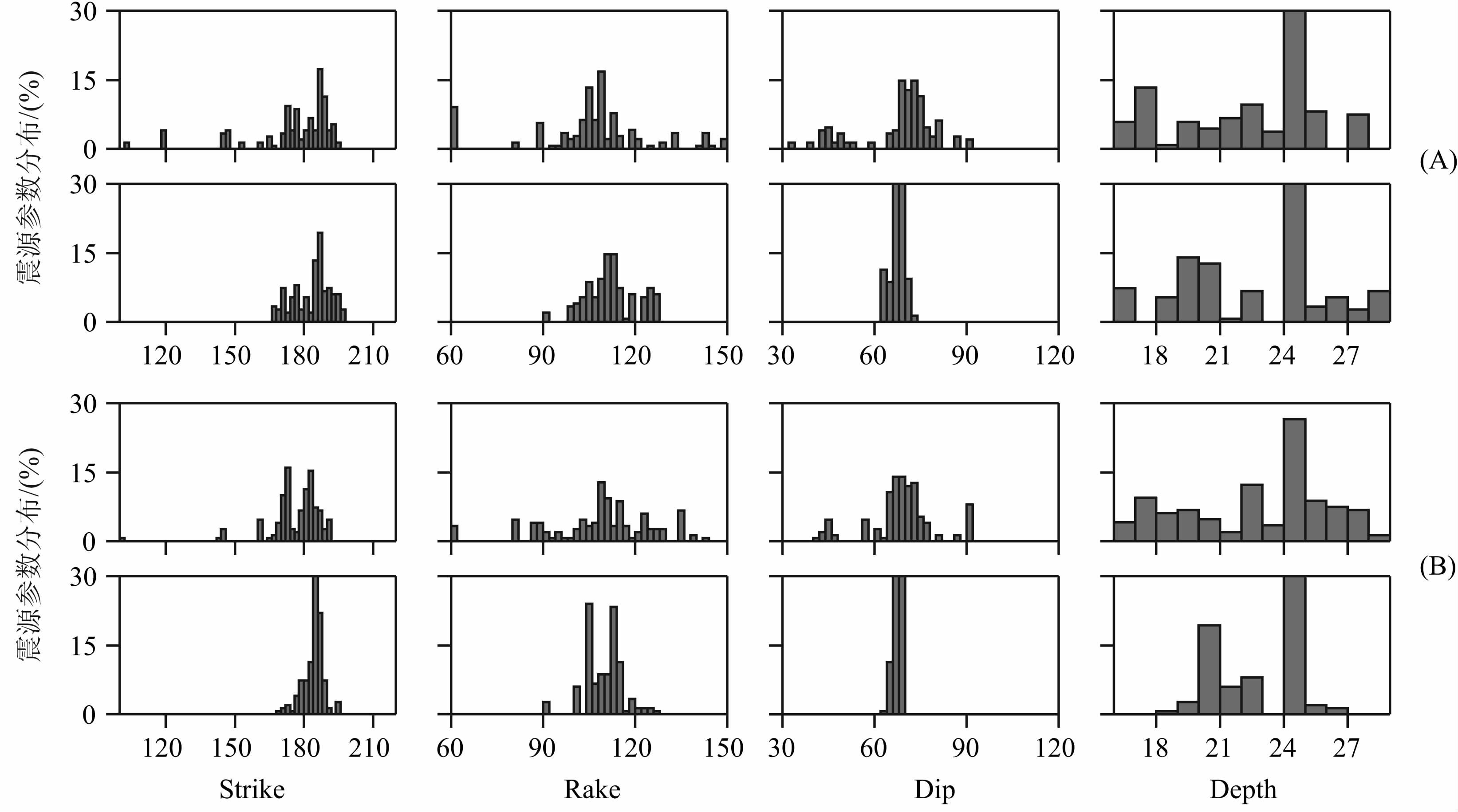 图 4 Bootstrap法对台站进行重抽样后得到的震源参数分布直方图 (A)上方为双近台测试结果,下方为双近台与远台联合反演结果;(B)上方为三近台测试结果,下方为三近台与远台联合反演结果. Fig. 4 Source parameters distribution histograms with Bootstrap method (A) Figures of top row show the results derived from two local stations test,while bottom row shows the results of joint inversion with two local stations and teleseismic data; (B) Results derived from three local stations. |