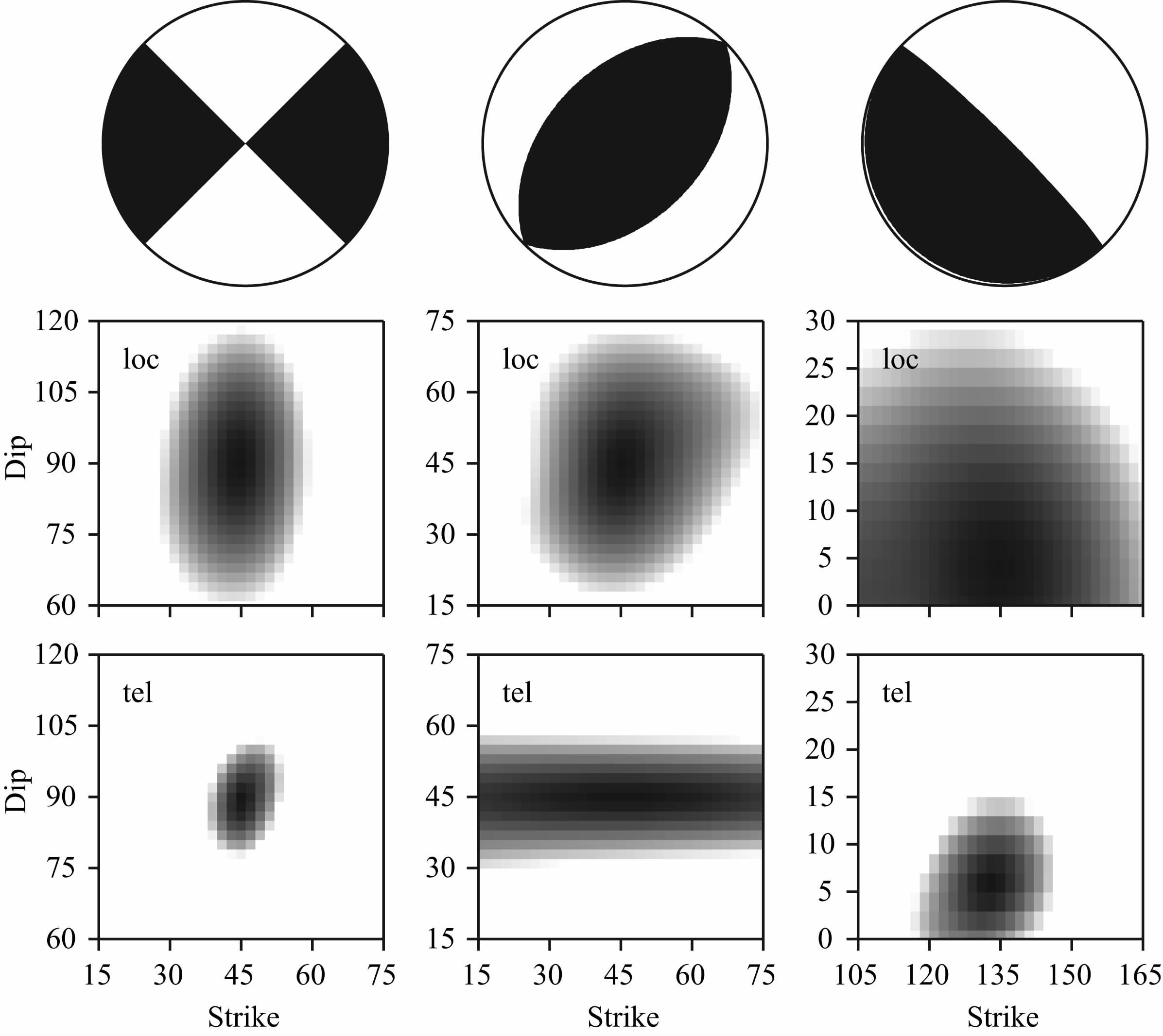 结果如图 5显示,我们选取相同色标分别显示在近台与远台波形反演过程后的误差分布,灰度越高代表误差值越小,白色表示超出预先设定的最大误差值,在同一坐标轴方向上灰度区域越窄,代表该方向上的敏感度越高.在纯走滑机制解下,远震数据对走向与倾角均较近震数据有更佳的约束作用,这是由于近震数据离源角较大,更靠近震源球边缘,在台站数相同的情况下,较靠近中心的远震台站,其分布就显得较为离散,影响了其对机制解参数的约束作用.然而,在45°纯倾滑机制解下,虽然远震数据在倾角上的约束作用仍然有优势,但由于其分布过于集中在震源球中心附近,采样的是同样极性的区域,导致在走向上几乎完全失去了分辨率.这表明,远震体波数据本身在震源球上采样的先天劣势,使其不能在参数反演中完全取代近震数据的地位.而对于倾角5°的逆冲型地震,震源球的象限更接近于对半分开,此时,由于远震采样更靠近中心,其对走向及倾角的约束则更胜于近震数据,而近震数据处在震源球边缘,当其分布距离象限分界线较远时,往往反演结果的稳定性会较远震来的较差.