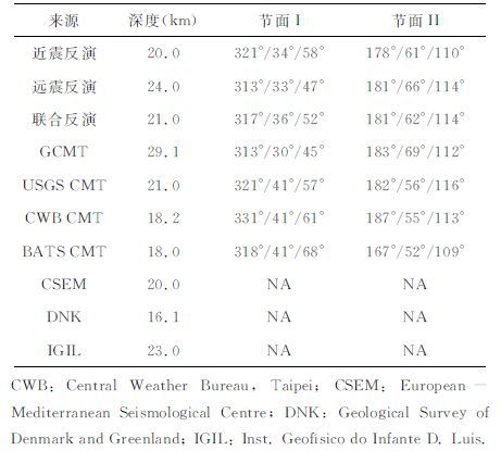 本文利用近震与远震宽频带地震仪记录数据,采用CAP,CAPtele,CAPjoint方法分别反演得到2010年高雄地震的震源机制解与震源深度,其中联合反演方法所得到的最佳双力偶机制解为:节面1: 走向317°,倾角36°,滑移角52°,节面2:走向181°,倾角62°,滑移角114°,深度为21km.为当地常见的逆冲型地震,并带有部分左旋分量.两个节面中,南北走向节面的倾角较大(本文结果均高于60°),故说明对不同震中距反演以另一西北-东南走向节面为实际破裂面的可能性更大.为确定这个结果,需要对余震序列做进一步分析.