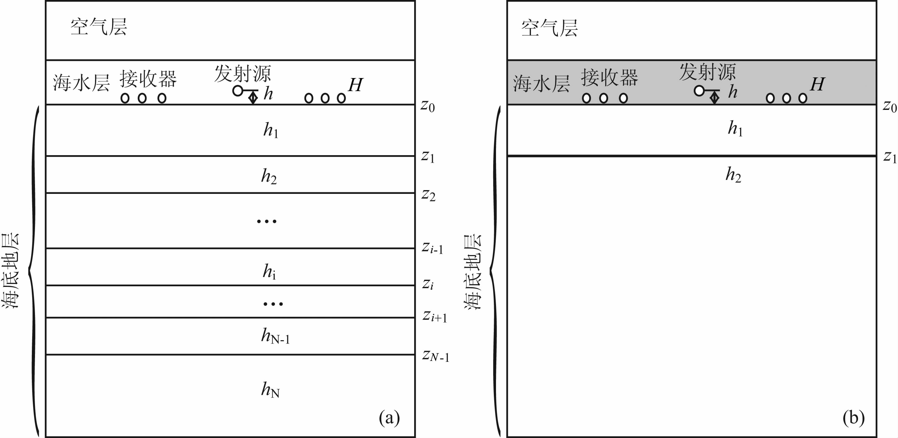 对于有限厚海水层和海底多层的情况,也可用上面的方法导出相应的位函数和场函数关系.如图 2a所示,以海底作为z0 =0的坐标平面,源处于海底以上h米处,海水层厚为H米,海底以下第i层地层的厚度和底界深度分别为hi,zi,则空气层、海水层和海底各地层的位函数形式解为
