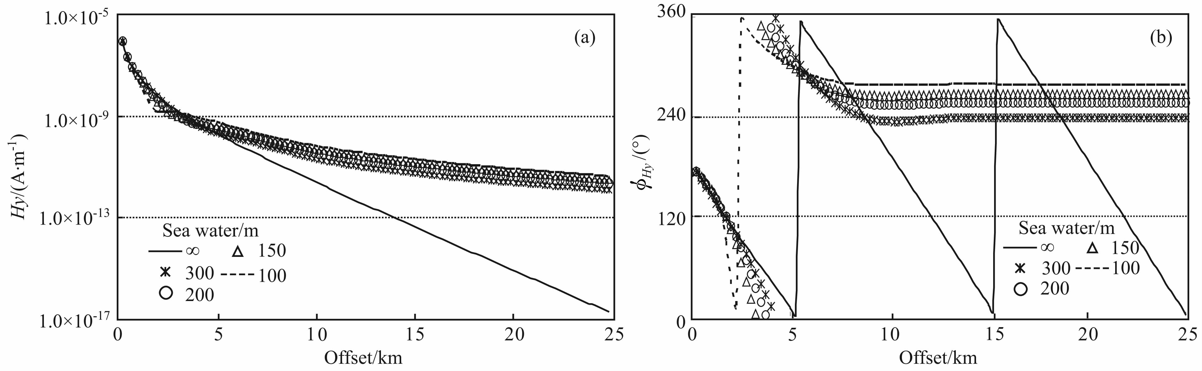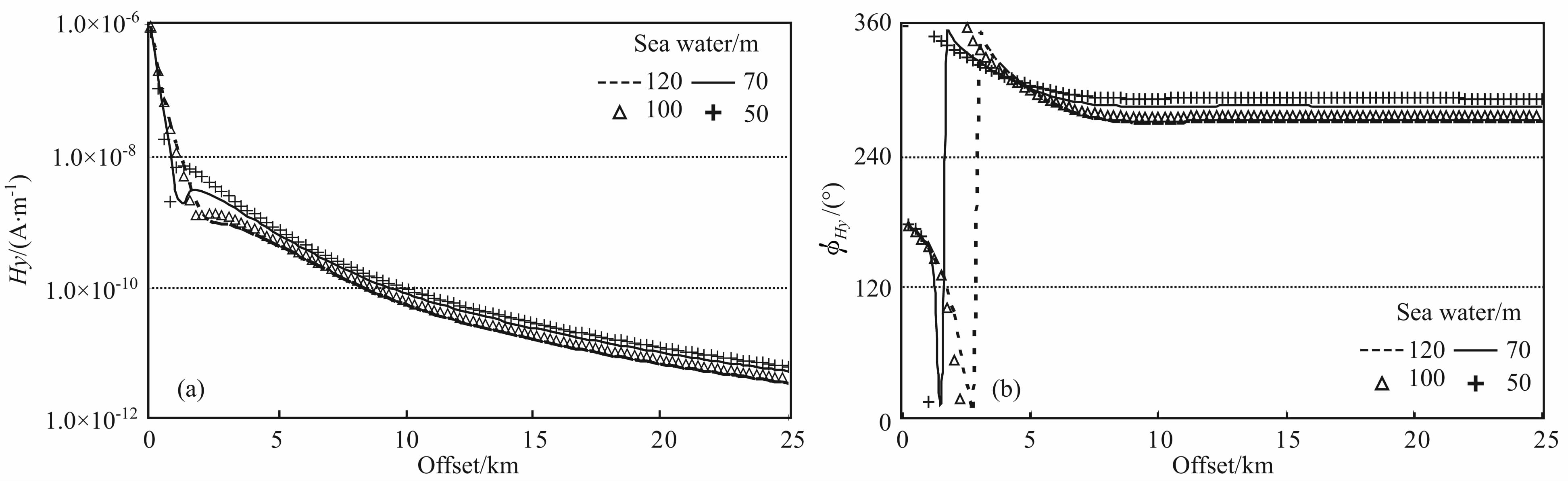 图 3 Hy分量在不同海水深度的磁场幅度(a)和相位响应(b),激发频率为0.25 Hz Fig. 3 Amplitude and phase of Hy component in different sea water depths at excited frequency of0.25 Hz |