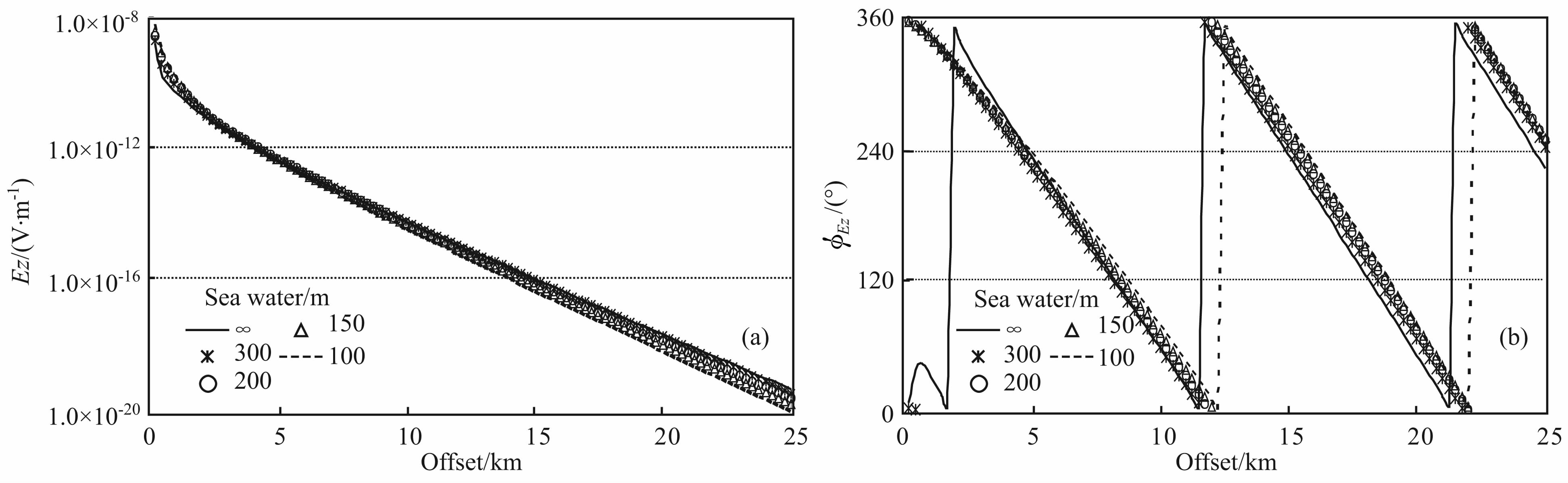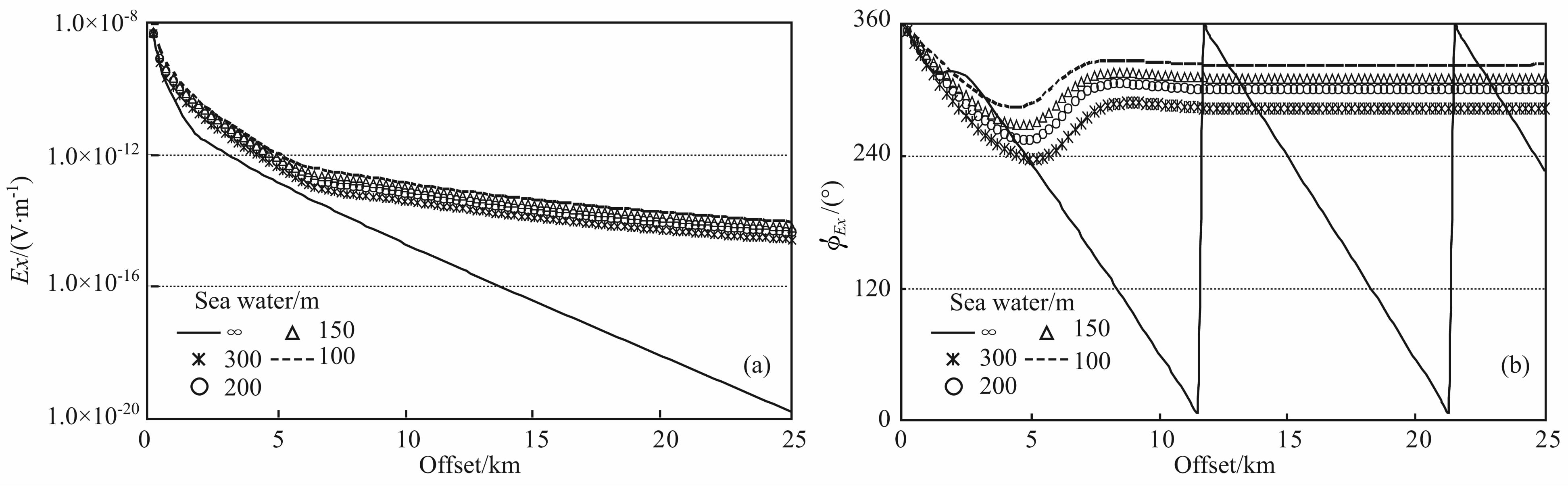 图 4(a, b)给出了电场Ex分量在不同水深时的幅度和相位响应.与磁场Hy分量类似,在半对数刻度图上,无限厚海水时电场幅度随偏移距增大线性降低,而在100、150、200m 和300m4个水深上,幅度曲线在临界偏移距5.0km 以斜率急剧变小的拐点,之后也呈现近线性的衰减趋势.相位曲线上,将无限水深的曲线作为参考画出,同样在近5.0km以外,相位曲线变得平坦,300m 水深的曲线与其它水深的相位响应存在较大差异.