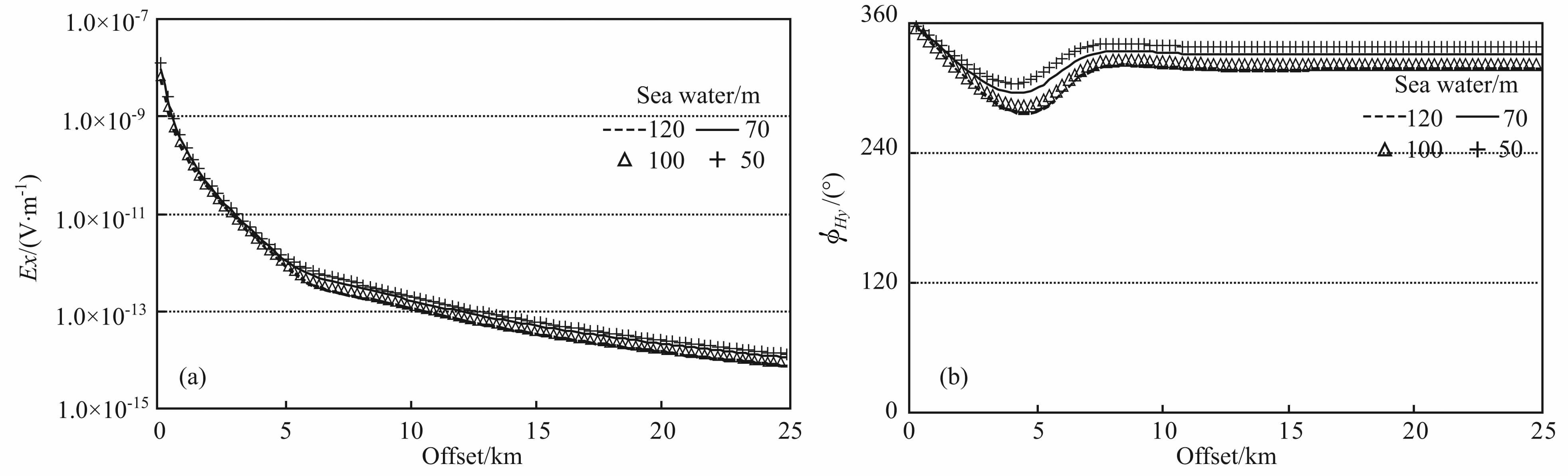 为了考察更浅水深时电磁场的响应特征,我们进一步考察了源放置于海底上方25 m 处,接收器置于海底,水深在50、70、100m 和120m 时电磁场的响应.Fig. 6(a, b)给出了源距海底25m, 接收器置于海底,磁场Hy分量在水深为50、70、100 m 和120m 四个不同深度时的幅度和相位曲线,激发频率为0.25Hz.图中看到,在这四个水深上,空气波占优的临界偏移距明显变小,在近2.5km 处幅度曲线斜率均出现突变,相位相位曲线在空气波出现的偏移距上发生突变,而且,空气波占主导时相位曲线变得平坦.