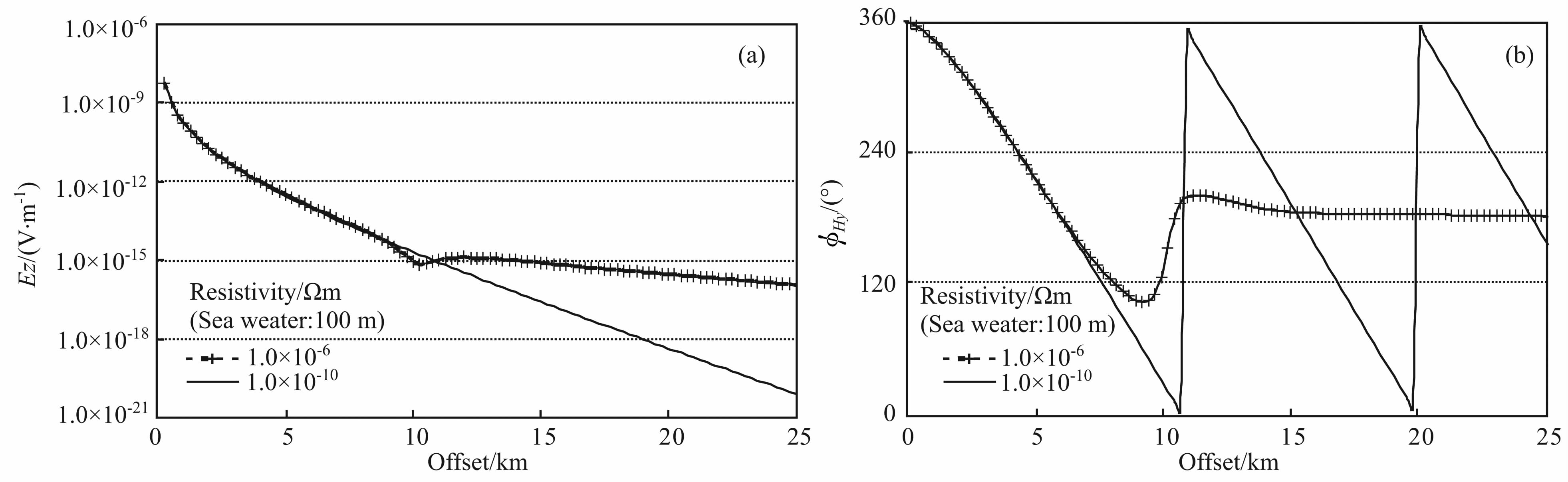 图 8(a, b)给出了源距海底高度25m, 接收器置于海底条件下,电场Ez分量在不同海水深度的幅度和相位响应,激发频率为0.25 Hz.图中看到,在这4个海水深度上,尽管不同偏移距上,幅度曲线的斜率也存在微小的变化,总体上,幅度曲线随偏移距近似线性衰减,斜率变化不大.这说明,电场Ez分量受空气波影响较小.相位曲线的变化也与无限水深相似,对应不同水深只存在微小的相位移.因此,在浅水域测量电场Ez分量,可以较好地避免空气波的严重影响.实际上,由于受到海水波动和海底洋流等因素的影响,大尺度垂直接收天线的应用至今仍然没有很好解决,这也是未来浅水域海洋电磁勘探硬件设备努力的方向之一.