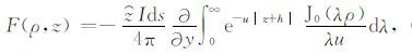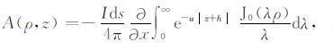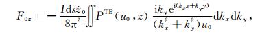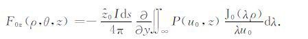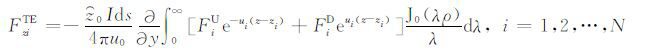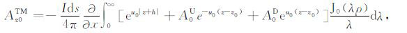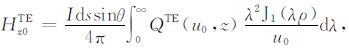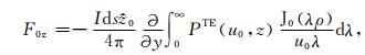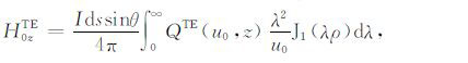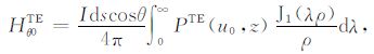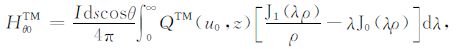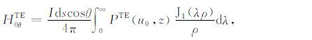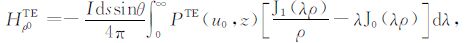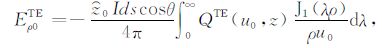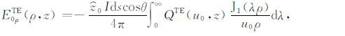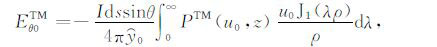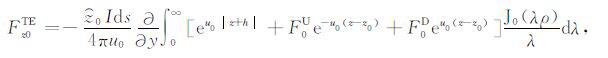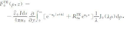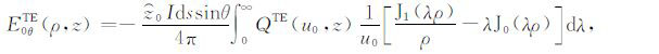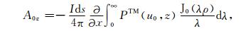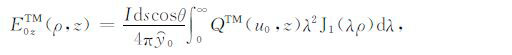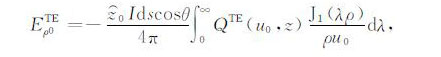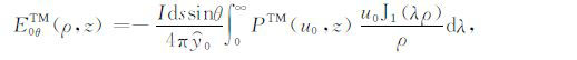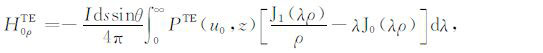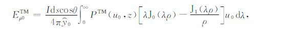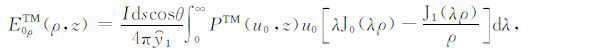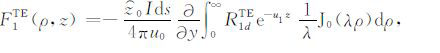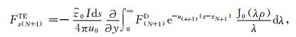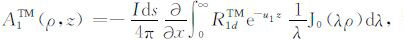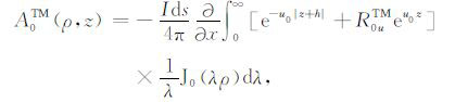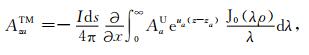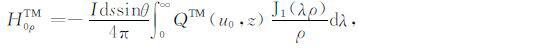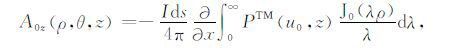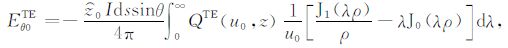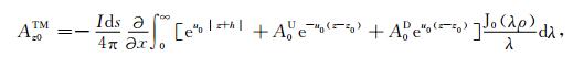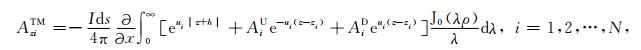 其中,A0TM (ρ,z)、A1TM (ρ,z)、F0TE (ρ,z)和F1TE(ρ,z)分别表示在海水和海底地层激发的TM 和TE 模式的电磁位函数;ρ = (x2 +y2)1/2 为径向距离,λ2 =kx2+ky2为柱坐标下的空间波数,ui= (kx2+ky2-ki2)1/2,i=0,1分别是与海水和海底地层参数相关的波数,