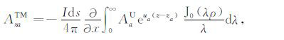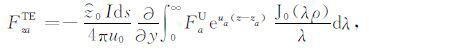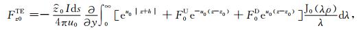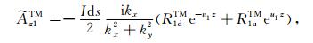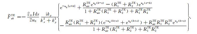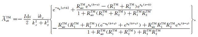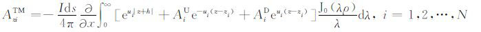 对于可控源海洋电磁测量中的水平电偶极子,有Jms =0,Jes =Idsx,其中Ids和x分别是水平电偶极子的偶极矩和x方向的单位矢量.将方程(1)中的电场和磁场强度分解为横电(TE)和横磁(TM)两种模式,即:
