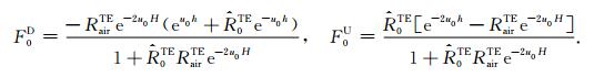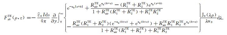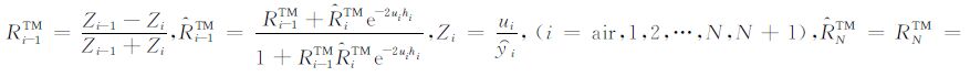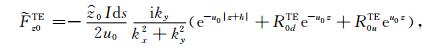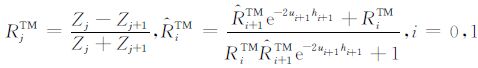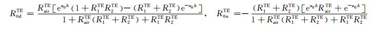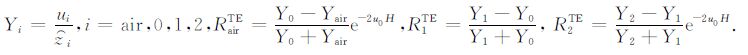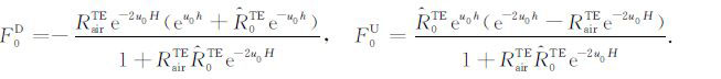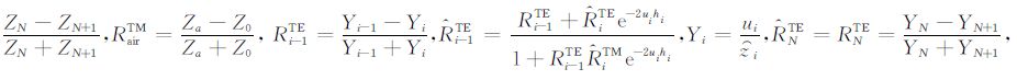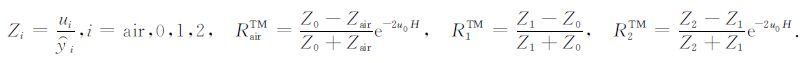 其中,RTMairu、RTM0u 、RTM0d 、RTM1u 、RTM1d 和RTM2d 分别是TM 模式的电磁场在介质air、介质0、介质1和介质2之间界面的上行和下行传播系数;RTEairu、RTE0u 、RTE0d 、RTE1u 、RTE1d 、RTE2d 分别是TE 模式的电磁场在介质air、介质0、介质1和介质2之间界面的上行和下行传播系数.
