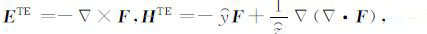 为了分析方便,利用Schelkunoff定义的两个矢量位函数A和F[12],导出HED 激发源电磁场的横电(TE)和横磁(TM)两种模式,相应地方程(2)中的电场和磁场与位函数A和F具有如下关系[12-13]: