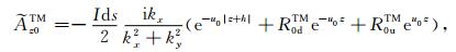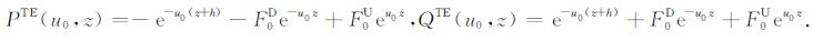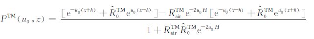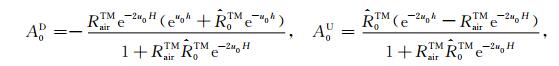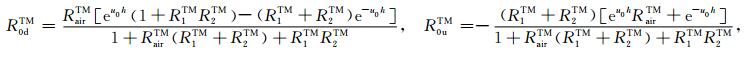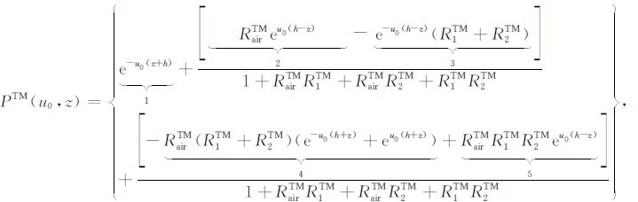设坐标原点位于海水与海底地层的交界面,由两种模式的电场和磁场切向分量连续性条件得到TM 和TE 模式电磁场的上行和下行反射和透射系数为