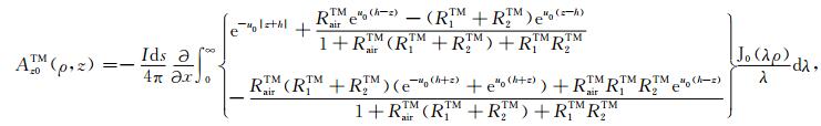 由附录A 中的关系(A1)—(A5)的通解知道,空气介质air、海水层介质0、地层介质1和介质2中TM和TE 模式的电磁位在空间波数域的形式解为