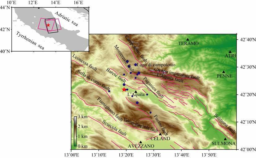 图 1 L'AqUla地区地质和地震分布图.五角星为震中位置,蓝色圆点为地震后一年内的M4〜5级(蓝色小点)和M5〜6级(蓝色大点)的余震,黑色线条为Paganica断层,其他粉色线条为区域内的活动断层,黑色三角形为行政区域分布.左上图中方框所在区域为SAR影像覆盖区,其中粉色为EnVst卫星、黑色为ALOS卫星覆盖范围 Fig. 1 Geologic setting and seismicity of the L'Aquila region. The red star is the location of epicenter and blue circles represent aftershocks (small circles: M4〜5,big circles: M5〜6). The black line is Paganica faultand pink lines are other active faults in this region. The box in insetmap means area covered by SAR images,where the pink boxes indicate the area covered by ASAR data, and the black box indicates area covered by PALSAR data |