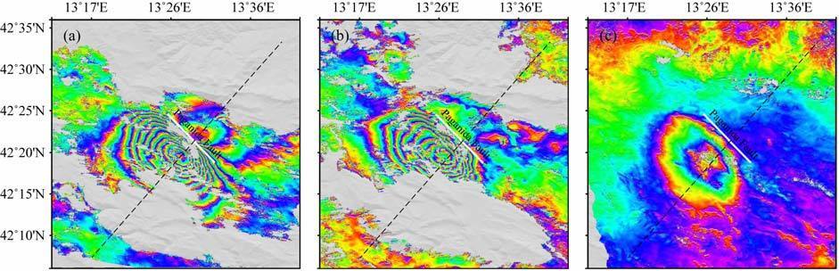 图 2 DInSAR干涉图(a)Envisat降轨Track 079干涉图(每一个条纹的变化代表LOS向2. 8 cm的形变);(b)Envisat升轨Track129干涉图(每一个条纹的变 化代表LOS向2. 8 cm的形变);(c) ALOS升轨Tack 638干涉图(每一个条纹的变化代表LOS向11. 8 cm的形变).白线为Paganica断层,虚线为用于图 3的垂直断层剖面. Fig. 2 DInSAR interferograms (a) Interferogram of Envisat descending Track 079 (Each fringe represents 2. 8 cm LOS displacement) ; (b) Interferogram of Envisat ascending Track 129 (Each fringe represents 2. 8 cm LOS displacement) ; (c) Interferogram of ALOS ascending Track 638 (Each fringe represents 11. 8 cm LOS displacement). The white line shows the Paganica fault and the dash line which cro^s the fault trace will be used in Fig. 3. |