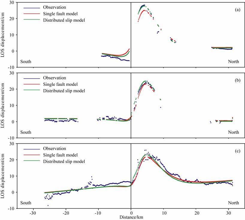 图 3 断层剖面(图 2中虚线位置)上的LOS形变及其拟合值(a)Envisat降轨Track 079断层剖面;(b) Envisat升轨Track129断层剖面;(c) ALOS升轨Track638断层剖面. Fig. 3 The observed and fitted LOS displacement of selected profile (dashed lines in Fig. 2)(a) Profile for Envisat descending Track 079; (b) Profile for Envisat ascending Track 129 ;c) Profile for ALOS ascending Track 638. |