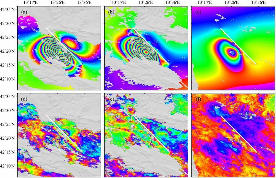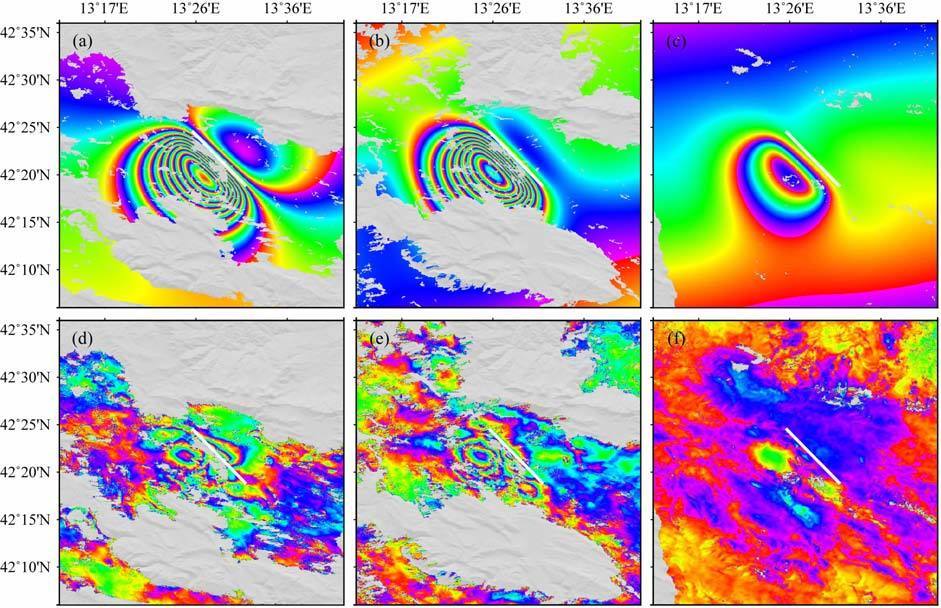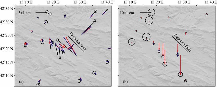 许多学者认为Paganica断层与相邻断层比较在地形活动上更弱[28],但来自当地的和遥感观测结果揭露了此次地震发生在Paganica断层,该断层恰好位于已认识的两个主要活动断层之间[10, 28-30],表明此次构造加载非单一的主地震带.这次观测使得在L′Aquila以及相似地质区域确定潜在危险地震断层这一问题更加突出,应该提高多种测量手段对震间应变积累进行研究.