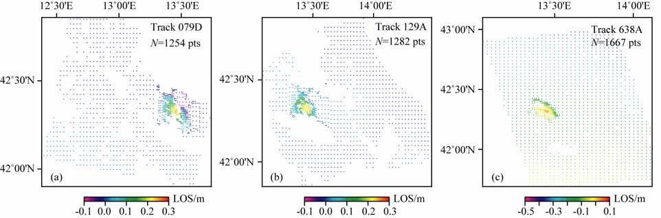 考虑到这两种采样方法的特点,为了处理上的方便,本文对远场数据进行均匀采样,对近场数据利用四叉树进行采样,采样结果如图 5.最后Track079、Track129和Track368三个轨道的原始干涉图经采样后的数据点数分别为1254、1282 和1667个,且近场点数密度大,远场点数密度小,采样结果更为合理,并且能有效地代表整个形变场的特征和量值.