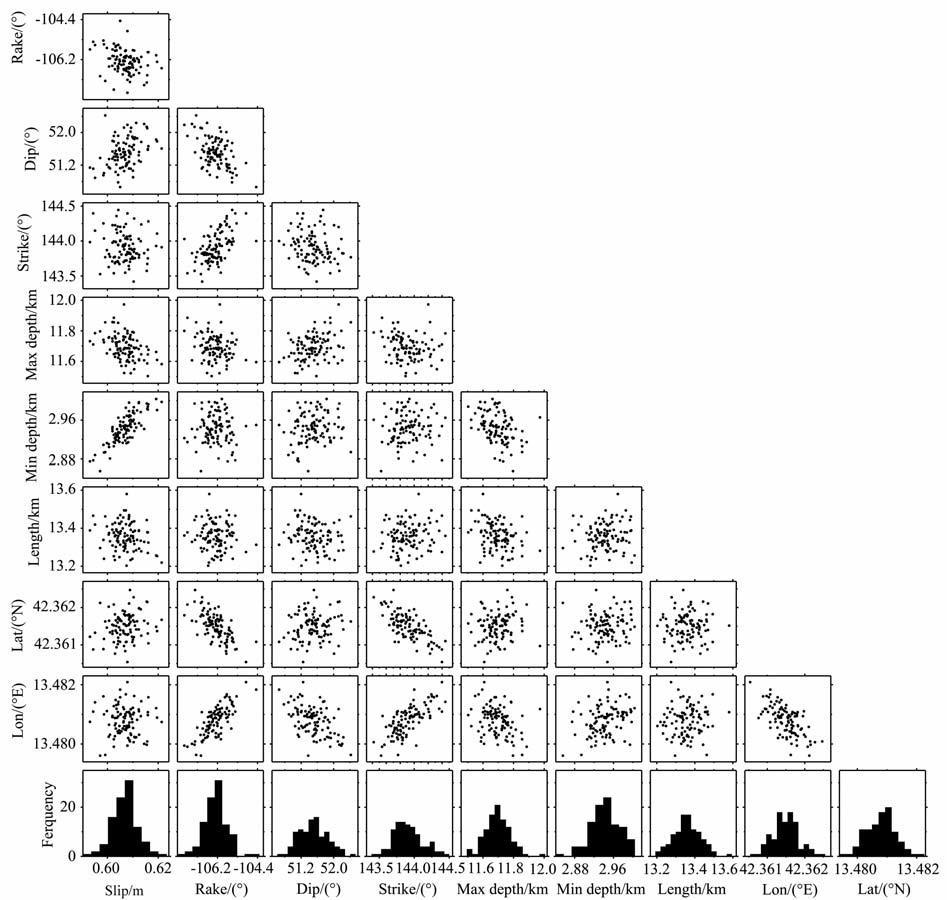 图 6 非线性反演的不确定性分析,基于蒙特卡洛方法的断层参数精度估计 Fig. 6 Uncertainty analysis for the nonlinear inversion and parameter precision estimation based on the Monte Carlo method |