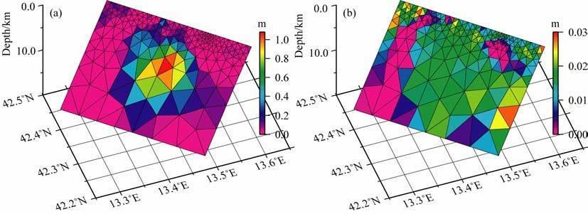 图 8中的基于断层自动剖分技术给出的最优断层模型由322个不同尺寸的三角元组成,并且可以看到,这些三角元中,尺寸较小的三角元主要分布在断层的近地表位置,而尺寸较大的三角元分布在深部位置;同震滑动分布主要发生在5~14km 深度范围内,平均滑移量为0.34m,平均滑动角为-96.0°,最大滑移量达1.07 m,滑动角为-102.8°,深度为6.1km.分布式滑动分布结果显示了断层为正倾滑和少量的右旋走滑,与野外调查结果一致[13].为了估计分布式滑动反演获取的断层面滑动分布的精度,与均匀滑动分布模型的精度确定方法类似,这里也对原始观测数据生成100组带随机扰动误差的数据集,通过这些数据计算出相应的滑动分布结果,从而估计出模型的精度,得到的同震滑动分布的误差如图 8b.从图 8b中的误差分布图中可以看出,断层滑移的误差分布比较均匀,平均误差为0.01 m,说明分布式滑动模型反演得到的滑动分布是可靠的,其最大误差分布在断层面的右下方位置,达0.03m.