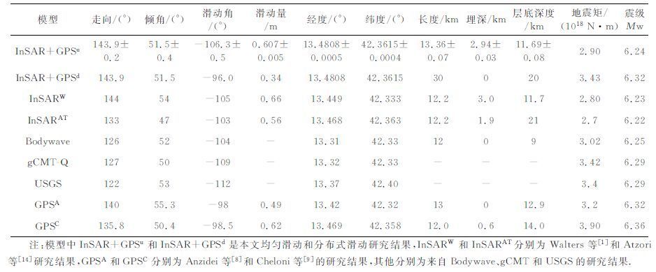 表 2 不同研究给出的反震断层几何和运动学参数 Table 2 The various source parameters for the L Aquila earthquake |