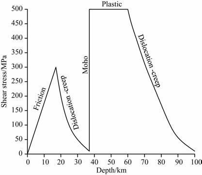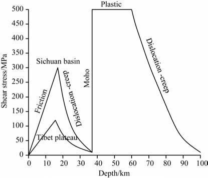 图 5 修改后的有限元模型本构关系,龙门山断裂带东 四川盆地岩石强度较大,龙门山断裂带西侧,青藏高 原岩石强度较小 Fig. 5 The constitutive relationship of finite elementmodel with the depth change after we modified the creep strength. The strength of Sichuan Basin's lithosphere is big,but the Tibet plateau is small |