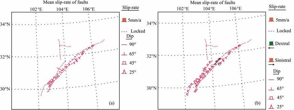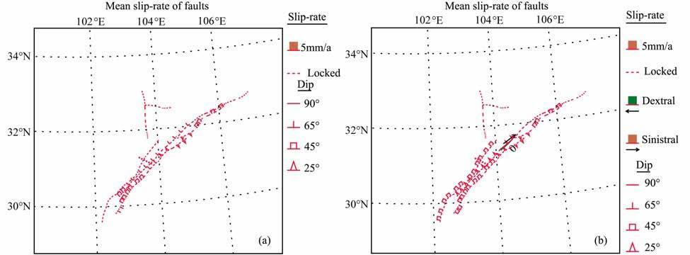 图 9 (a)断层倾角都设为75°断层首先错动发生在映秀;(b)断层倾角都设为30°断层首先错动发生前山断裂.虚线表示断层死锁,绿色方块代表右旋走滑,橘色方块代表左旋走滑,蓝色方块代表逆冲断层,粉色代表正断层 Fig. 9 All dip angle of faults set to 75°,the initial rupture piont occurred at Yingxiu; (b) All dip angle of faults set to 30° the initial rupture piontoccurred on the Qianshan fault. The dashed line represented faults locked,the green represented dextral,the orange represented sinistral, the blue represented thrust faults, the pink represented normal faults |