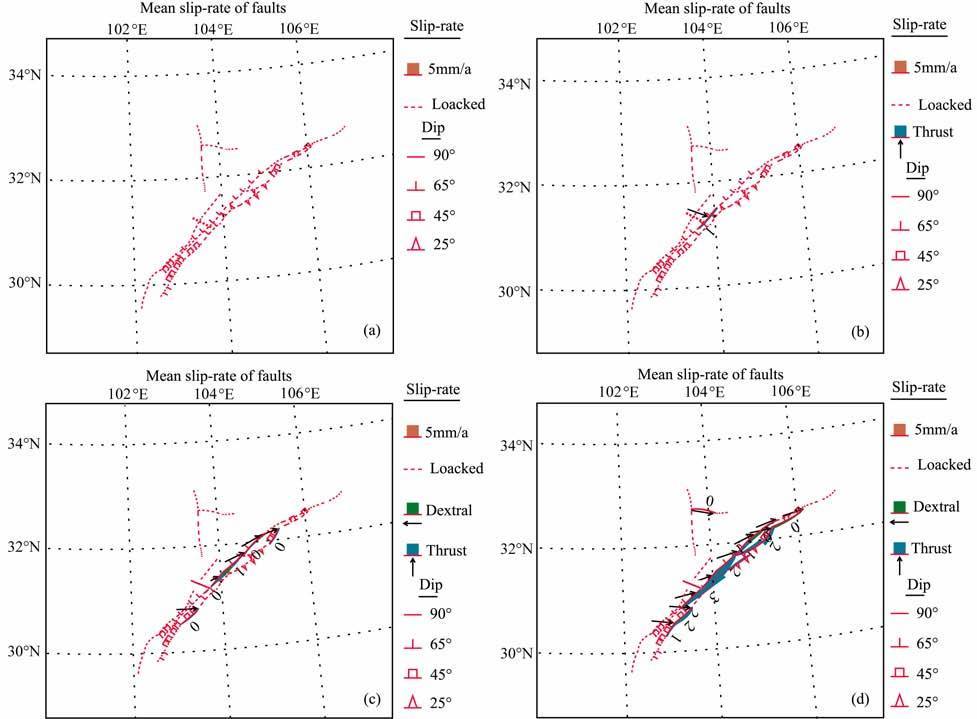 我们调整模型断层摩擦系数降低到0.48(表 2模型3)的时候,断层开始错动,初始破裂点发生在映秀段(图 13b).断层进入滑动以后,我们将模型的断层的摩擦系数减小到0.45(表 2 模型4),断层进一步沿着北川段向北东方向滑动(图 13c).当调整模型的摩擦系数到0.4(表 2模型5)的时候,进入破裂的断层单元越来越多(图 13d),断层在龙门山断裂带南端表现逆冲挤压,经过高川兼有右旋走滑分量,进入北川以走滑分量为主.