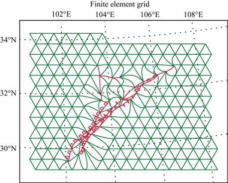 Faults程序的主要特点是研究较小区域的单一或者几条断层,本文的研究目的是讨论影响龙门山断裂带破裂过程的因素,因此就研究对象只选取了龙门山三条断裂以及虎牙平武断裂.根据龙门山区域构造地质学背景,确定龙门山区域的活动断裂几何模型如图 2,绿色三角形单元表示地块单元,红色线表示断层单元.为避免有限元模型的边界效应对模拟结果的干扰,在考虑尽量不增大计算量的同时使模型远大于目标工作区.所取范围从东经100°~108°,北纬29°~35°.模型垂直区域从地表到上地幔.模型中主要活动断层地理位置信息是对邓起东整理的中国活动断层图进行数字化得到的[19].Faults有限元程序利用摩擦力原则描述断层的不连续单元,Faults程序能够刻画断层的倾角、走向以及断层深度这三个几何参数(表 1),但不能刻画龙门山断裂带近水平的滑脱面.