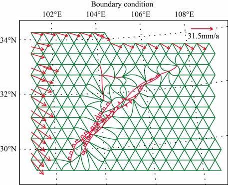 模型的左边界和上边界的边界节点的速度值采用最临近位置GPS 实际观测结果(相对于欧亚板块)给出,不靠近GPS 台站的其他边界点速度值通过线性插值得到(图 4).模型的东部和南部边界条件给固定位移边界为0mm/a(图 6).红色箭头表示GPS大小及方向.