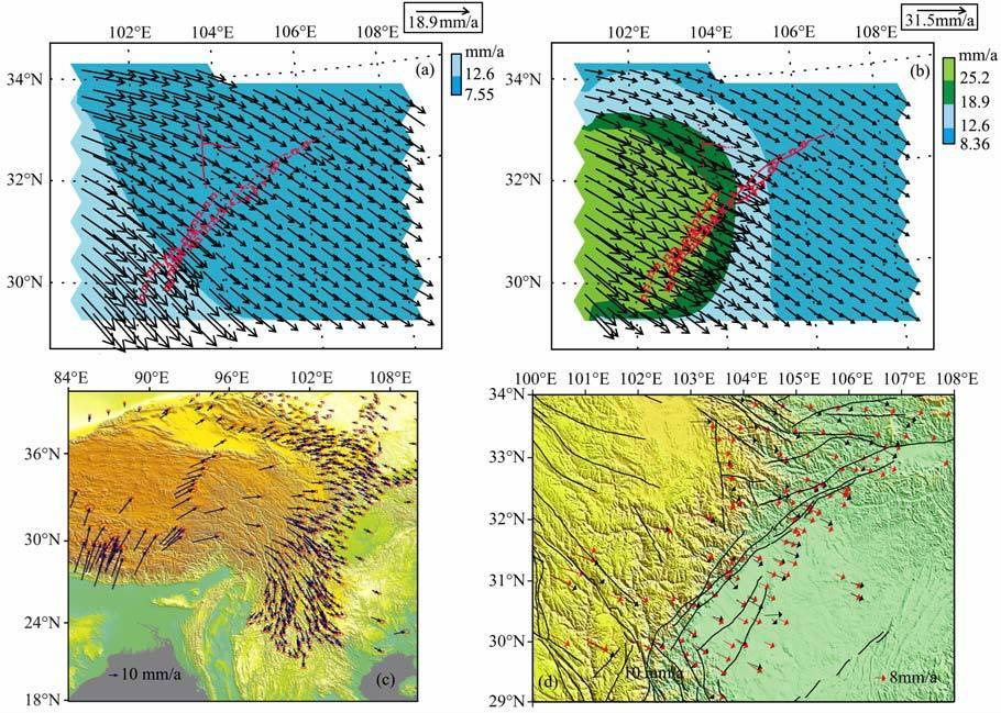 图 7 地表运动速率(a)模型设定所有岩石单元为统一流变强度得到的地表运动速率;(b)模型设定为龙门断裂带左侧流变性较大、右侧流变性较小得到的地表运动速率;(c)GPS观测得到的地表运动速率(张培震、沈正康)[24] ;(d)图b的模型计算结果和图c的对比,黑色箭头为实测GPS值,红色箭头为本文计算结果. Fig. 7 The surface velocity(a)The surface velocity when the rhelogical strength of the model set to be unique;b)The surface velocity when the rhelogical strength |