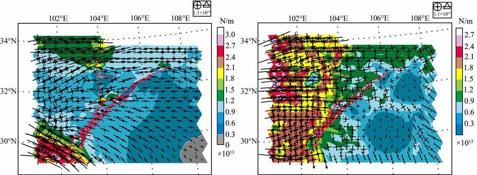 3.2 地形影响(重力作用)对区域地壳运动和构造应力场的影响在确定了流变强度之后,我们对青藏高原与四川盆地的显著地形差异对区域地壳运动和构造应力场的影响进行了研究.别洛乌索夫认为山区重力在真实应力场中占有重要地位,因此我们希望通过实验模拟青藏高原由于巨大的海拔产生的重力对龙门山区域的影响.由图 8 我们可以看出地形产生的重力对构造应力场产生了较大的影响,同时考虑地形的构造应力场更符合真实构造应力场.