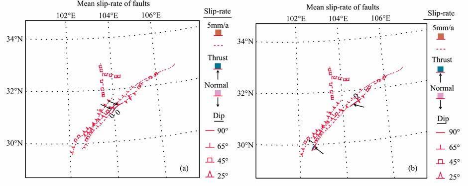 3.1 流变强度对地壳运动速率(GPS)的影响我们利用2.8节提出的方法对模型的流变强度做了修改,给定一个比例因子,1 为原模型的设定,设定龙门山西侧较为软的中下地壳强度为0.4,龙门山东侧较硬的四川盆地的中下地壳强度为4,得到了模型区域内的地壳运动速率.图 7 比较了流变强度统一设定为1 的区域内地壳运动速率(图 7a)和流变强度设定为西侧较弱,东侧较强的区域内地壳运动速率(图 7b).可以看到在给定龙门山西侧中下地壳较大的流变性之后,地表运动速率呈现变大的现象,而东侧设定为中下地壳较为坚硬,地表运动速率显著变小.因此流变强度的差异对模型存在较大的影响,本文后续试验都是基于不同单元体不同流变强度的模型.