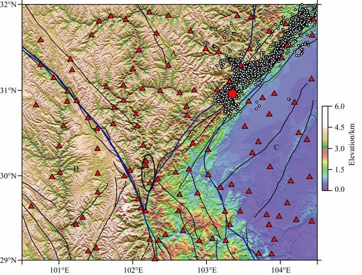 图 1 川西台阵台站分布图 红色三角表示地震台站,红色圆圈表示汶川地震主震,白色圆圈表示余震,黑色实线表示断层,蓝色实线表示块体边界;A:松潘一 甘孜地块,B:龙门山断裂破裂带,C:四川盆地,D:川滇地块,E:龙门山断裂与鲜水河断裂交汇附近同震波速相对增加区 Fig. 1 Station map of western Sichuan seismic array Red triangles represent the stations, red circle represents the main shock of Wenchuan earthquake, white circles represent aftershocks, black solid lines represent the fault, blue solid lines represent boundaries of different blocks. A: Songpan-Garze block, B: Longmenshan fault , C: Sichuan basin , D:Chuandian block , E: The area of the intersection of LMS fault and Xianshuihe fault where coseismic velocity increase. |