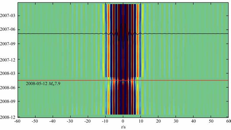 图 2 KCD01台站垂直分量50天滑动窗平均自相关函数(ZZ).黑色曲线代表参考自相关函数,红色直线指示汶川地震发生时间.相关函数振幅归一化,并滤波至1~3s Fig. 2 Vertical component of Fitty-day’ s moving averaged autocorrelation inunctions of the station KCD01(ZZ). Black curve represents the reference autocorrelation function , red line indicates the time of Wenchuan earthquake. The correlation functions are filtered to 1〜3 s,and the amplitudes are normalized |