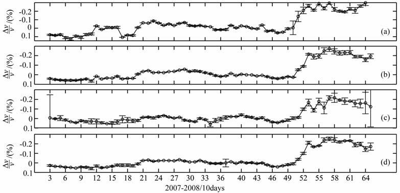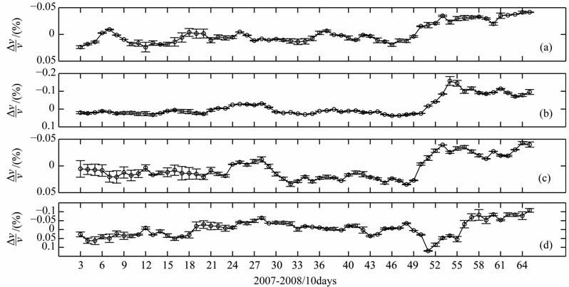 图 3 使用不同分量相关函数尾波所得速度相对变化率随时间变化 ⑴由水平南北分量(S-N)噪声自相关函数尾波(NN)所得结果;(b)由三分量自相关尾波(ZZ,EE,NN)所得平均结果;(c)由三分量互相关 函数尾波(ZE,ZN,NE)所得平均结果;(d)由三分量自相关函数与三分量互相关函数尾波(ZZ,EE,NN,ZE,ZN,NE)所得平均结果.横坐标每一个数字以10天为单位. Fig. 3 Relative velocity changes with time using the coda of different components of correlation functions (a) Using the coda of one horizontal component(S-N) of autocorrelation functions(NN) only; (b) Using the coda of three components of autocorrelation functions(ZZ,EE, NN) ; (c) Using the coda of three components of corsscorrelation functions(ZE,ZN,NE) ; (d) Both the coda of three components of autocorrelation functions and three components of crosscorrelation functions(ZZ, EE, NN,ZE, ZN, EN) are used. |