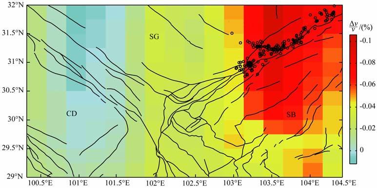 图 5 同震速度相对变化分布 黑色实圈代表汶川地震震中位置,黑色圆圈和黑点代表余震分布,细线代表断层.CD:川滇块体,SG:松潘一甘孜块体,SB:四川盆地 Fig. 5 Distribution of coseismic relative velocity changes Big black solid circle represents the main shock of Wenchuan earthquake, other small circles represent aftershocks, black lines represent faults. CD: Sichuan一 Yunnan block,SG: Songpan-Garze block,SB: Sichuan basin. |