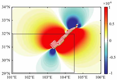图 6 汶川地震的同震体应变.体应变计算深度为 5 km,红色代表膨胀区域,蓝色代表压缩区域,中间白 色网格为断层模型,黑色实线所围区域为本文研究区域 Fig. 6 The volumetric strain changes caused by the Wenchuan earthquake. The volumetric strain changes are calculated at the depth of 5 km,the red and blue colors represent the region of dilatation and compression respectively ’ the black square indicates the area researched in this paper |