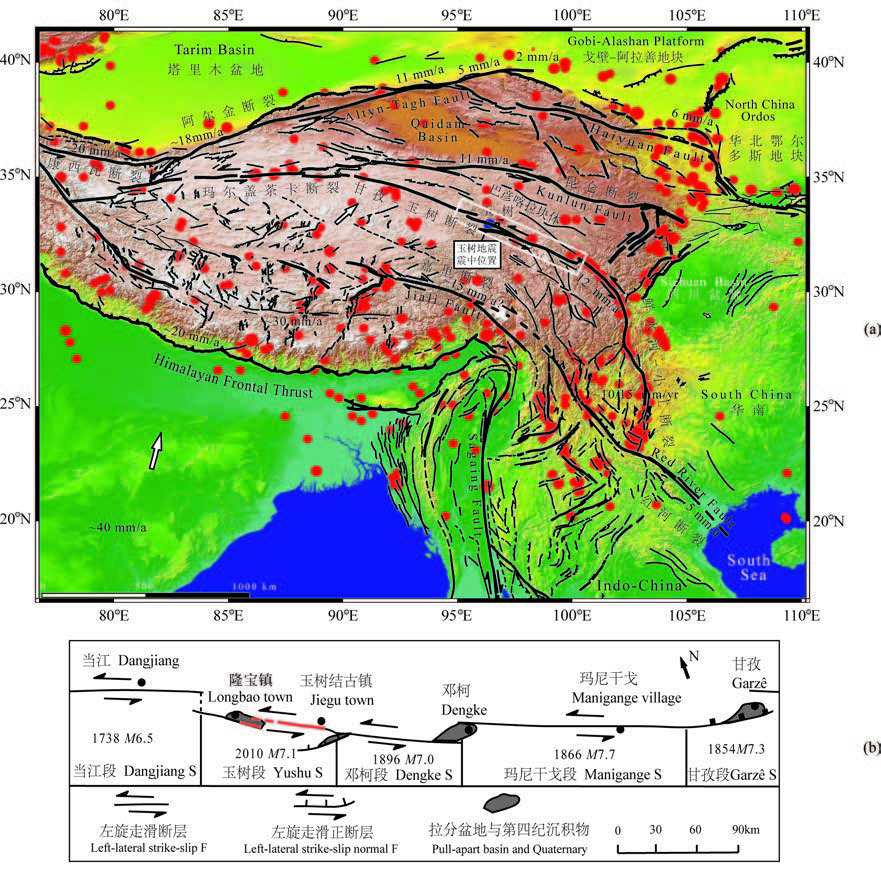图 1 (a)玉树地震区域地震构造图(据参考文献[13, 14]修改),红色圆圈代表历史地震震中,蓝色圆圈代表玉树地震震中; (b)甘孜一玉树断裂历史地震破裂分段与玉树地震破裂的填空作用,红色线条代表 2010年4月14日7.1级地震地表破裂 Fig. 1 Regional seismotectonic map of the Yushu earthquake (a) and segmentation of the historical earthquake ruptures along the Ganze-Yushu earthquake(b). Red dots tn (a) are history epicenter,blue one isYushu earthquake’s epicenter. Red lines in (b) are the surface rupture of the Yushu earthquake which happened on Apr 14th ,2010 |