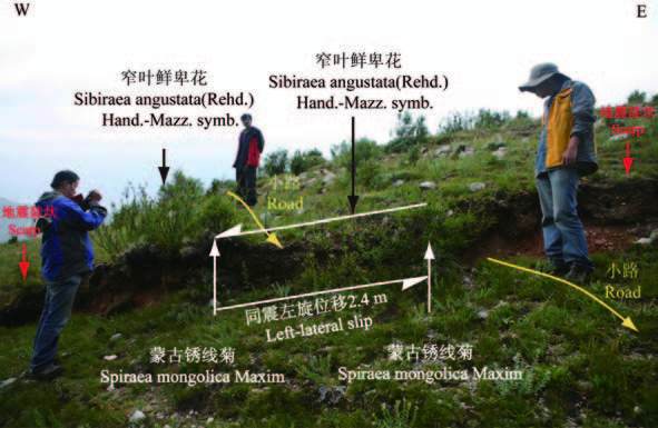 结古次级地表破裂带绝大部分地段主要沿切割基岩山坡的先存断层迹线分布,野外可见先存断层和叠加在先存断层迹线之上的地震地表破裂带切割横跨的河流阶地等线性地貌和田埂等人文标志,测量表明结古次级地表破裂带的同震左旋位移量较结隆次级地表破裂带的要大(表 1),在堪扣至左尔拉两村南山大河沟东侧山坡位置(96.86097°E,33.0650°N; 或表 1序号26)测量到小路、蒙古锈线菊和窄叶鲜卑花丛被左旋切割,最大同震左旋位移量为2.4 m±0.2 m,伴随着0.6 m 垂直位移(图 10);在该观测点西侧大河沟内还测量到河岸、阶地等的同震错动,量值在1.9~2.1 m(表 1 序号22,23).加吉娘村附近可见地表破裂带切割村内排水水渠、房屋墙基等人工线性标志,测量可知左旋位移量约为1m(表 1序号31-36),并伴随有北西盘少量抬升.在南东段斜切河谷地带也测量到0.6~0.8m 同震左旋位移量,反映西南盘抬升的垂直位移量约为0.5~0.7m(图 5(a、b)).因此,结古次级破裂带长度约31km(图 2),最大同震左旋位移值2.4m,也是玉树地震地表破裂带上测量到的最大同震左旋位移值,平均同震左旋位移值1.3 m,东南端存在明显的逆冲垂直分量,最大垂直位移可达0.7m.