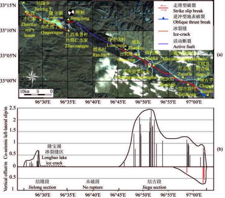 3.2.2 同震破裂构造内涵讨论玉树地震地表破裂带上述基本特征和同震位移分布等至少反映出玉树地震具有分段破裂过程和羌塘块体向东运动的双重指示意义.