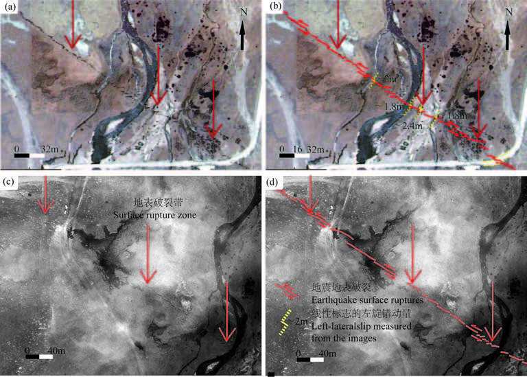 图 3 果庆益荣松多玉树地震地表破裂的航卫片影像解译实例 (a)航片影像展示的地震地表破裂;(b)航片影像上地震地表破裂填图结果;(c) World-View卫星影像 展示的地震地表破裂;(d)卫星影像上地震地表破裂填图结果. Fig. 3 Examples of mapping ground ruptures with airphotoes and high resolution satellite images at Guoqingyirongsongduo Village (a) Airphoto shows the co-seismic surface rupture;b) Co-seismic surface rupture mapping from the airphoto;c) World-view satellite imagery shows the co-seismic surface rupture;d) Co-seismic surface rupture mapping from the World-view satellite imagery. |