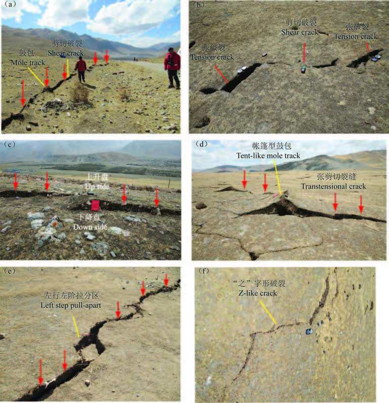 图 4 玉树地震典型剪切破裂与张剪切破裂实例 (a)结古次级破裂带结古镇南牧民安置点加吉娘村羽列状剪切破裂与鼓包(96.98956°E; 32. 99165°N);(b)结隆次级破裂带南北向公路东 剪切破裂及其端部张性破裂(96. 48237°E; 32. 21186°N);(c)结古次级破裂带布庆给村羽列状张剪切破裂正断层倾滑(96. 93267°E; 33.01282°N);(d)结隆次级破裂带南北向公路西张剪切破裂与鼓包(96.46392°E; 33.21727°N);(e)结古次级破裂带结古镇南牧民安置点 加吉娘村张剪切破裂与小拉分盆地或陷落坑(96. 98945°E; 32. 99174°N);()隆宝湖北“之字形”张剪切破裂(96. 46945°E; 33. 21542°N). Fig. 4 Typical shear cracks and transtensional cracks for the Yushu earthquake (a) Jiegu sectionJiajiniang feather shear cracks and mole tracks(96. 98956°E; 32. 99165°N) ; (b) Jielong section north-south road east shear cracks and transtensional cracks of the end of the rupture(96. 48237°E; 32. 21186°N); (c) Jiegu section Buqingji feather transtensional cracks and nomal fault slip(96. 93267°E; 33. 01282°N); (d) Jielong section north-south road west transtensional cracks and mole tracks (96. 46392°E; 33. 21727°N); (e) Jiegu sectionJiajiniang transtensional cracks and small pull-apart(96. 98945°E; 32. 99174°N); (f) North of theLongbao lake “Z” liketanstensional cracks(96. 46945°E; 33. 21542°N). |