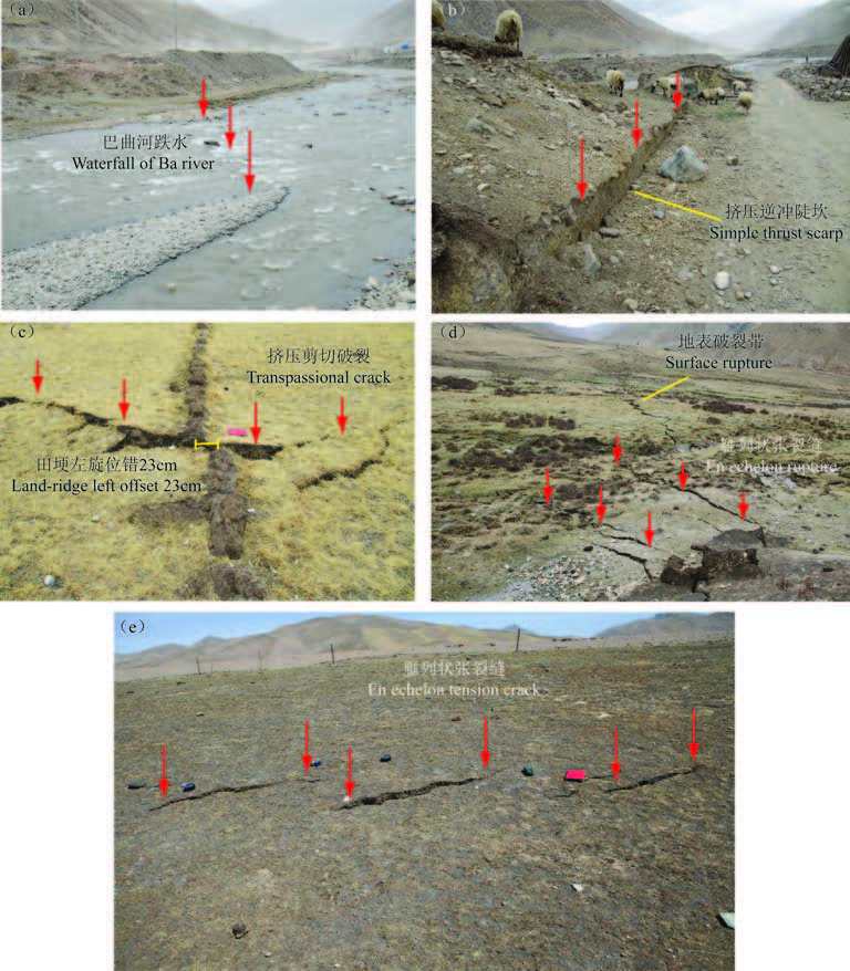 图 5 玉树地震典型压剪切破裂与张性破裂实例 (a)结古次级破裂带结古镇南巴曲河髙约45 cm跌水陡坎(97. 0338°E; 32. 95548°N) ;(b)结古次级破裂带结古镇南巴曲河西岸髙约70 cm 基岩逆断层陡坎(97. 03453°E; 32.9548°N);(c)结隆次级破裂带南北向公路东压剪切破裂与鼓包(96. 48217°E; 33. 21727°N);(d)结古次 级破裂带比莫隆村宽23 m雁列的张性破裂与整体地表破裂带(96.80628°E; 33. 08278°N);(e)隆宝湖北岸雁列张性裂缝(6. 58402°E; 33. 19719°N). Fig. 5 Typical transpressional cracks and tension cracks for the Yushu earthquake (a) Jiegu section Ba-river waterfall»45cm height(97. 0338°E; 32. 95548°N) ; (b) Jiegu section simple thrust scarp in the bedrock at the bank of the Ba-river,70cmheight (97. 03453°E; 32. 9548°N); (c) Jielongsectionnorth-southroadeast transpressional cracksandmoletracks (96. 48217°E; 33. 21727°N) ;d) Jiegu section Bimolong en echelon transtensional cracks,23m width(96. 80628°E; 33. 08278°N); (e) En echelon transtensional cracks at the north bank of the Longbao lake(96. 58402°E; 33. 19719°N). |