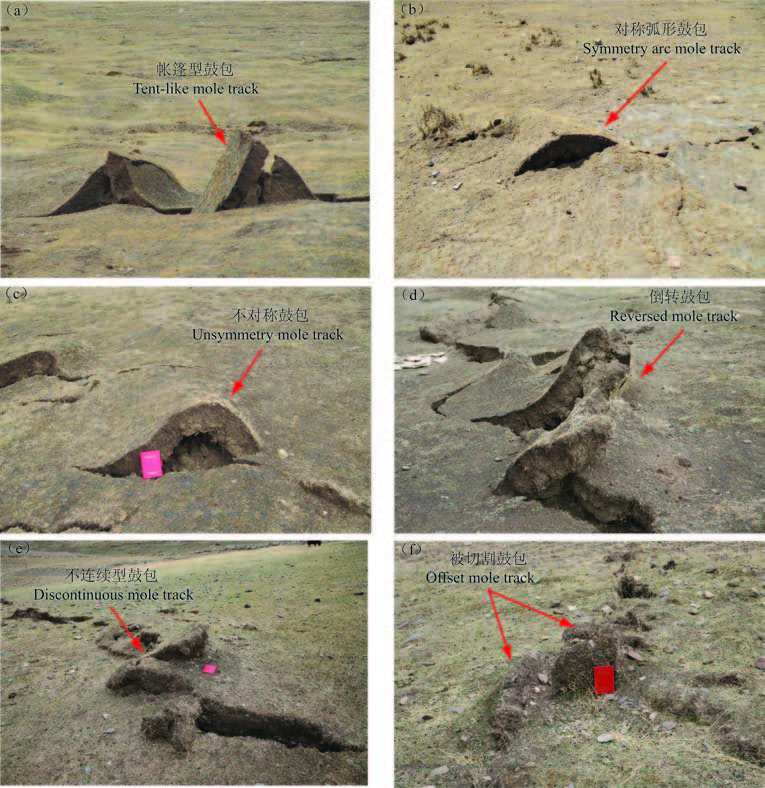 图 6 玉树地震地表破裂鼓包类型 (a)结隆次级破裂带南北向公路东多杰然丁家附近帐篷型鼓包(96. 4879°E; 33. 21106°N);(b)结古次级破裂带纳利库圆弧状鼓包 (96. 82736°E; 33.07187°N);(c)结隆次级破裂带南北向公路东多杰然丁家附近不对称圆弧状鼓包(96.48814°E; 33.21105°N);(d)结古次级破 裂带比莫隆村倒转型鼓包(96.80483°E; 33. 08365°N);(e)结古次级破裂带纳利库村附近不连续破裂型鼓包(6. 82542°E; 33.07289°N); ()结古次级破裂带纳利库村附近被剪切破裂切割的鼓包(6. 82576°E; 33.0727°N). Fig. 6 Types of mole tracks for the Yushu earthquake (a) Jielong section north-south road east tent-like mole tracks near Duojieranding,s home ( 96. 4879°E; 33. 21106°N) ,(b) Jiegu section Naliku arc mole tracks ( 96. 82736° E,33. 07187° N) ,(c) Jielong section north-south road east unsymmetry arc mole tracks near Duojieranding’shome (96. 48814°E; 33. 21105°N) ,(d) Jiegu section Bimolong reversed mole tracks (96. 80483°E,33. 08365°N); (e) Jiegu section Naliku discontinuous mole tracks (96. 82542°E,33. 07289°N); (f) Jiegu section Naliku offset mole tracks (96. 82576°E,33. 0727° |