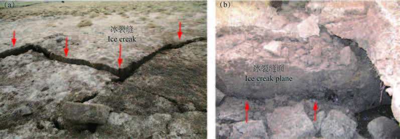 图 7 玉树地震产生的冰裂缝特征 (a)结隆次级破裂带东端隆宝湖南扎西普桑村北近于直角相交的冰裂缝(96.5804°E; 33.16703°N);(b)隆宝湖南侧平直光滑的冰裂缝面(96.50809°E,33.20189°N). Fig. 7 Ice-crack features produced during the Yushu earthquake (a)Ice cracks almost vertical crosssed located at the south of Longbao lake at the east end of the Jielong section(96. 5804°E; 33.16703°N);(b)Smooth ice crack surface at the south of the Longbao lake (96. 50809°E,33. 20189°N). |
