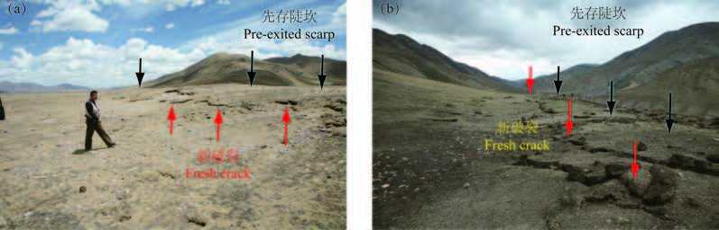 图 8 新生地震地表破裂与先存断层陡坎关系图 (a)结隆次级破裂带南北向公路西侧洪积扇顶部新破裂叠加在先存陡坎之上(96.47529°E; 33.21342°N);(b)结古次级破裂带比莫隆村髙阶地顶部新破裂叠加在先存陡坎之上(96.80518°E; 33.08343°N). Fig. 8 Photoes showing the Yushu earthquake surface cracks overprinted on the pre-existed fautt scarps (a) Jielong section surface cracks overprinted on the pre-existed fault scarps at the top of the alluvial an at the wett of the north-south road (96. 47529°E; 33.21342°N); (b) Jiegu section surface cracks overprinted on the pre-existed fault scarps at the top of the high terrace at Bimolong (96. 80518°E; 33. 08343°N). |