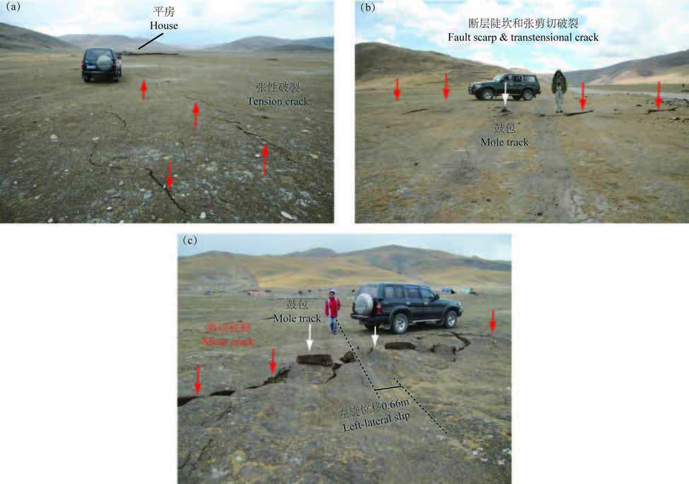 图 9 结隆次级地表破裂带典型同震断错地貌 (a)西端部雁列张性裂缝(96.43863°E,33. 226irN);b)隆宝湖西南北向土公路旁张剪切破裂与南髙北低断层陡坎 (96. 47792°E,33.21309°N) ; (c)结隆次级地表破裂带最大同震左旋位移量 0.66 m(96.4867°E,33.21107°N). Fig. 9 Surface rupture features along the Jielong rupture zone (a)Tension cracks at the west end of the surface rupture(96. 43863°E,33. 22611°N) ; (b)Transtensional cracks and fault scarps near the north-south road at the west of the Longbao lake(96. 47792°E,33. 21309°N) ; (c) Jielong section maximum co-seismic lett lateral slip 0. 66 m (6. 4867°E,33. 21107°N). |