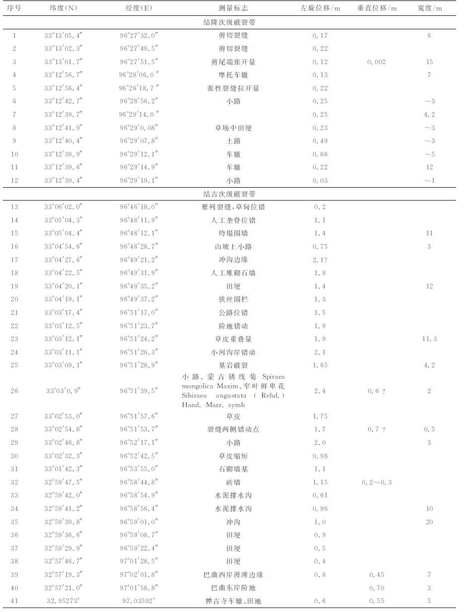 表 1 玉树地震地表破裂带实测同震位移量表 Table 1 Measured coseismic displacements of the Ms7. 1 Yushu earthquake |