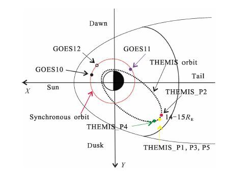 图 1 2007年3月3日1100~1500UT 期间THEMIS和GOES卫星轨道示意图 Fig. 1 Orbits of THEMIS and GOES satellites during1100~1500UT on march03.2007 |